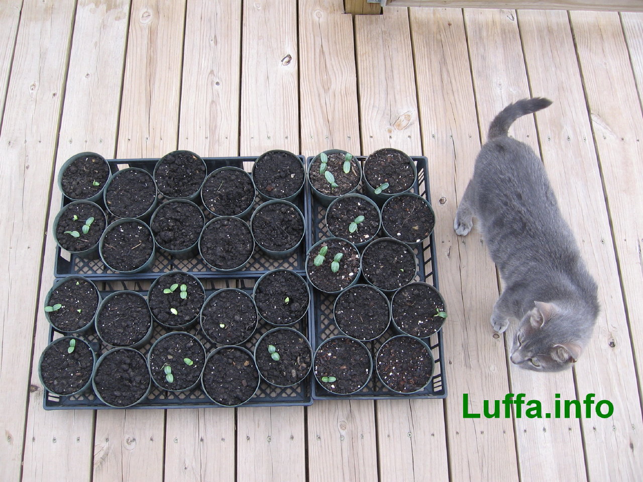 It's been 8 days since the luffa seeds were planted in pots and they are emerging with 32 sprouts showing out of 90 seeds so far. The next few days should see many more. The germination location was cooler than normal for a few days or they would be further along. A few pots got too much water and are lagging too. The seeds and sprouts don't like mucky soil. With any luck they'll dry out enough to grow. Been setting the pots out in the sun as much as possible. it's still cool at night so they come inside after sunset. One light feeding of nitrogen rich liquid organic fertilizer has been applied to keep them green.